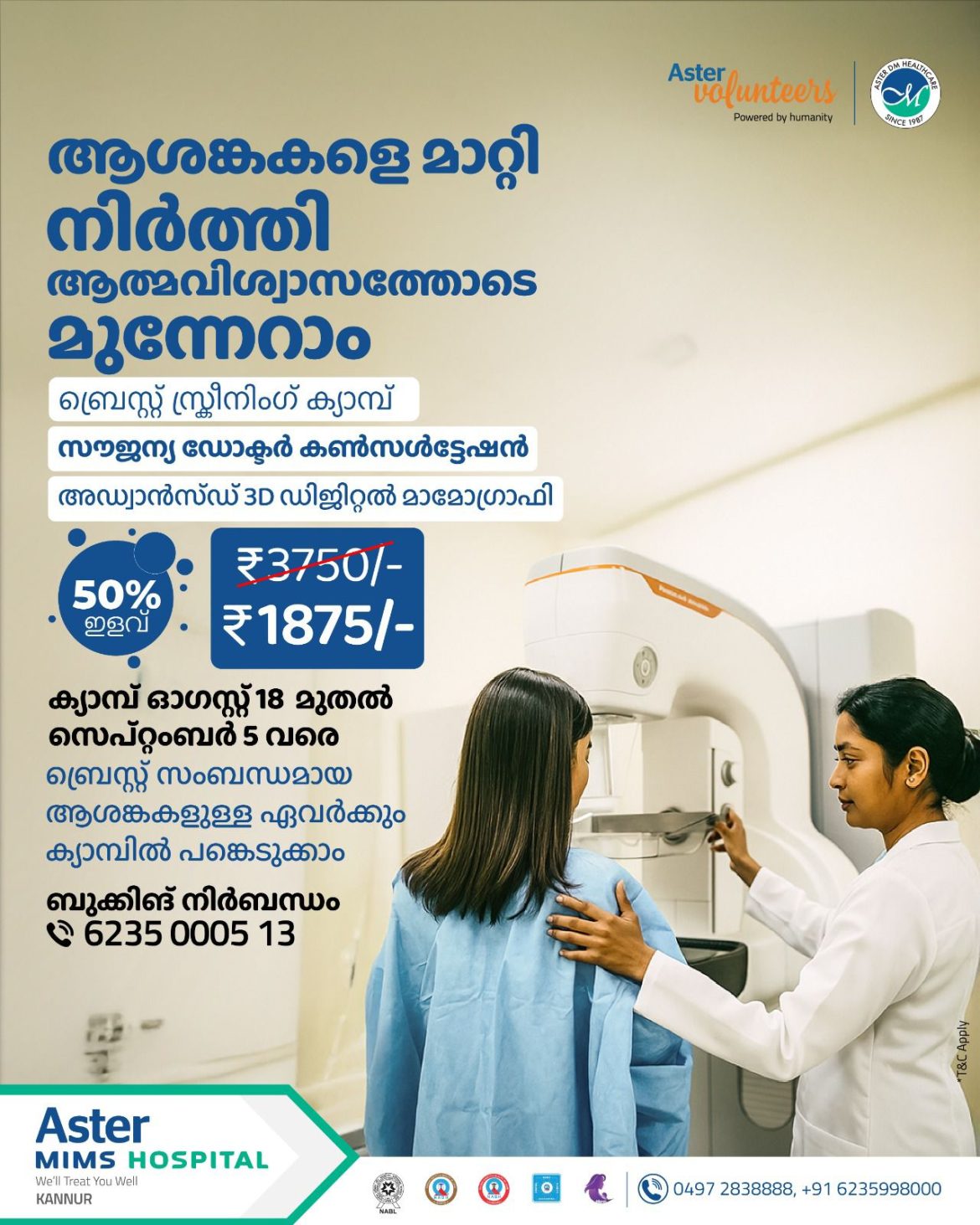 കൊയിലാണ്ടി : സ്തനസംബന്ധമായ ആശങ്കകൾ അകറ്റുന്നതിനും, കാന്‍സര്‍ ഉള്‍പ്പെടെയുള്ള രോഗങ്ങള്‍ നിര്‍ണ്ണയിക്കുന്നതിനായി കണ്ണൂര്‍ ആസ്റ്റര്‍ മിംസ് ഹോസ്പിറ്റലിന്റെയും ആസ്റ്റര്‍ വളണ്ടിയേഴ്‌സിന്റെയും നേതൃത്വത്തില്‍ ബ്രസ്റ്റ് സ്‌ക്രീനിംഗ് ക്യാമ്പും അഡ്വാന്‍സ്ഡ് 3ഡി ഡിജിറ്റല്‍ മാമ്മോഗ്രഫി പരിശോധനയും സംഘടിപ്പിക്കുന്നു. ഓഗസ്റ്റ് 18 മുതല്‍ സെപ്തംബര്‍ 5 വരെ നീണ്ടുനില്‍ക്കുന്ന ക്യാമ്പില്‍ സ്തനസംബന്ധമായ ആശങ്കയുള്ള ഏവര്‍ക്കും പങ്കെടുക്കാം. ക്യമ്പില്‍ പങ്കെടുക്കുന്നവര്‍ക്ക് ഡോക്ടര്‍മാരുടെ സൗജന്യ പരിശോധനയ്ക്ക് പുറമെ അഡ്വന്‍സ്ഡ് 3ഡി ഡിജിറ്റല്‍ മാമോഗ്രാഫിക്ക് 50% ഇളവും ലഭ്യമാകും.